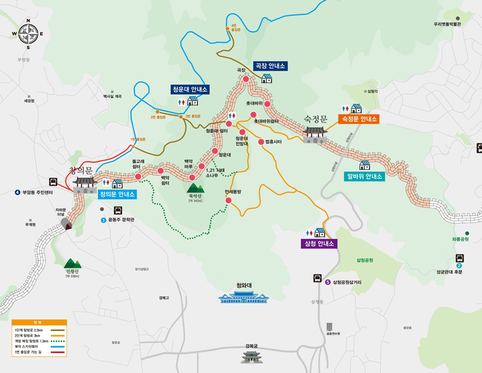 탐방안내소 운영도 재개된다. 탐방안내소는 북악산 일원을 보호와 이용객 안내 및 안전관리, 탐방 프로그램 제공 등의 역할를 수행한다. 또 국가유산청에서는 3월 중에 창의문·청운대·곡장·숙정문·말바위·삼청 등 6개소에 북악산 출입 안내소를 설치하고 운영할 계획이다.