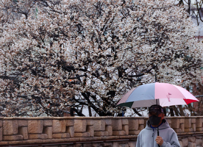 봄비가 내린 지난달 27일 부산 수영구 한 주택가에 활짝 핀 매화 앞으로 주민이 우산을 쓰고 지나가고 있다. (사진=연합뉴스) |