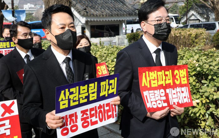 [서울=뉴스핌] 정일구 기자 = 장동혁 국민의힘 대표와 송언석 원내대표가 5일 오전 서울 종로구 청와대 분수대 앞에서 열린 현장 의원총회를 마친 뒤 손피켓을 들고 청와대 방향으로 행진하고 있다. 2026.03.05 mironj19@newspim.com