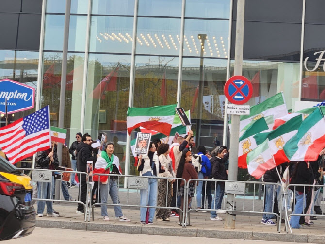 전시장 밖 이란 국기 들고 나온 시위대 집회