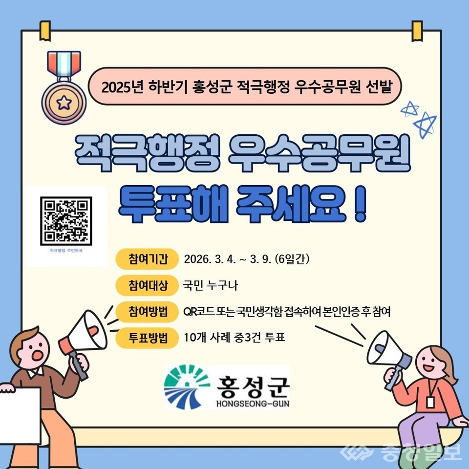 충남 홍성군이 '2025년 하반기 적극행정 우수공무원 선발'을 위해 오는 9일까지 국민권익위원회 '국민생각함' 플랫폼에서 온라인 주민 투표를 진행한다.