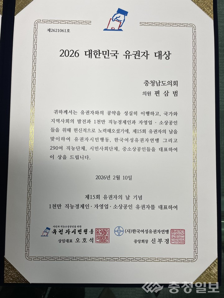 편삼범 충남도의회의원(보령제 2선거구)이 2월 10일 서울에서 열린 '제15회 유권자의 날' 기념식에서 '2026 대한민국 유권자 대상'을 수상했다.