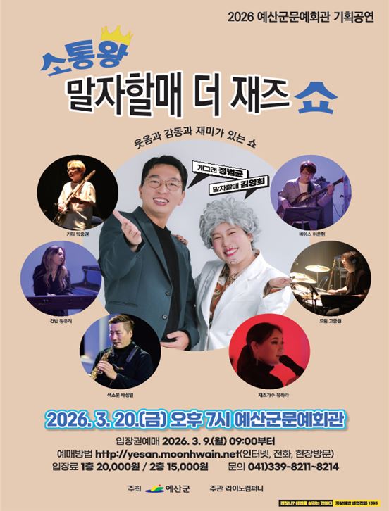충남 예산군은 오는 3월 20일 저녁 7시 문예회관 공연장에서 '소통왕 말자할매 더 재즈 쇼' 토크 콘서트를 개최한다고 밝혔다.