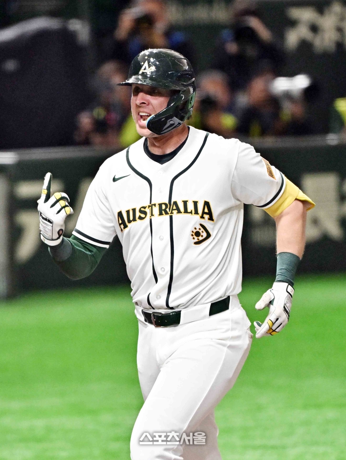 WBC 호주 야구대표팀의 퍼킨스가 5일 일본 도쿄 도쿄돔에서 열린 대만과의 경기 5회말 대만 투수 천보위를 상대로 2점 홈런을 친 뒤 기뻐하고 있다. 2026. 3. 5.