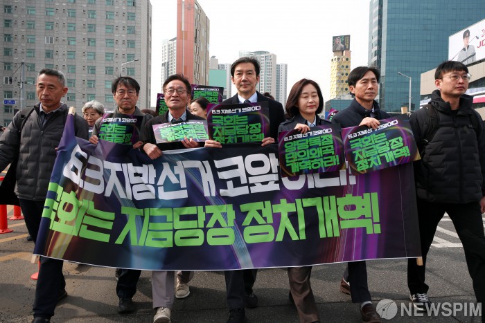 [서울=뉴스핌] 이건주 인턴기자 = 조국 조국혁신당 대표 등 야당 관계자들이 5일 오전 서울 영등포역 앞에서 열린 '2026 지방선거 정치개혁 촉구 시민대행진'에 참석하고 있다. 참가자들은 기자회견 후 국회 본청까지 행진하며 선거제도 개혁 입법을 촉구했다. 2026.03.05 kunjoo@newspim.com