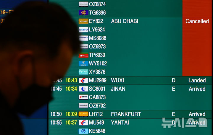 [인천공항=뉴시스] 황준선 기자 = 미국·이스라엘과 이란의 군사 충돌 여파로 중동 지역 항공편 차질이 이어지고 있는 5일 인천국제공항 1터미널 도착층 전광판에 아부 다비 발 항공편의 결항이 안내되고 있다. 2026.03.05. hwang@newsis.com |