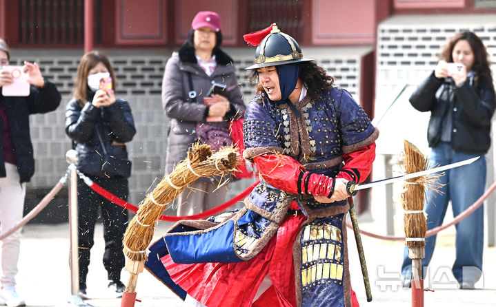 [수원=뉴시스] 김종택 기자 = 절기상 경칩인 5일 경기 수원시 팔달구 화성행궁에서 혹한기 정기휴연을 마친 수원시립공연단원들이 무예24기 공연을 펼치고 있다. 2026.03.05. jtk@newsis.com |
