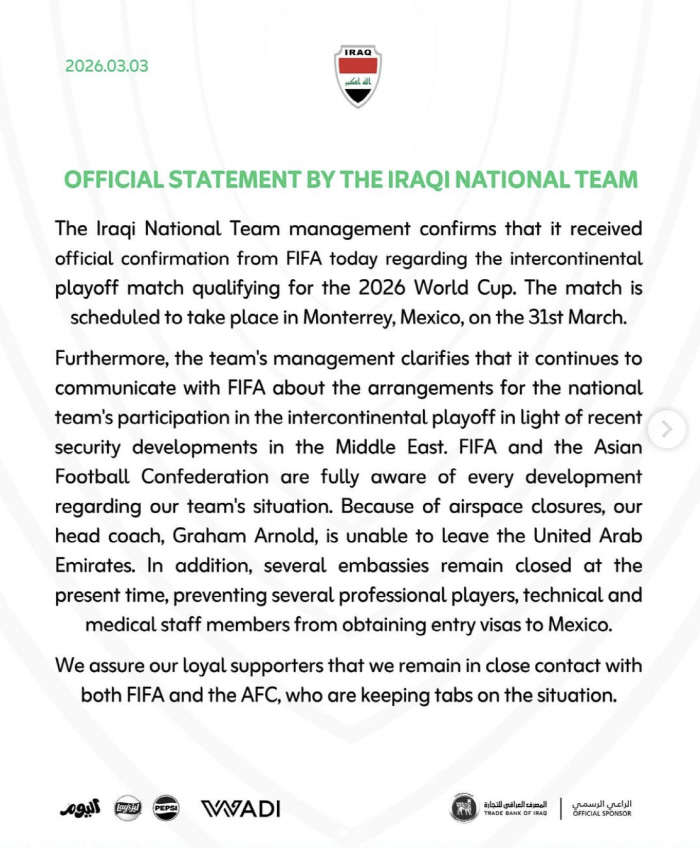 이라크 축구협회는 4일(이하 한국시각) 공식 계정을 통해 '이라크 대표팀 운영진은 2026년 북중미 월드컵 진출을 위한 대륙간 플레이오프 경기와 관련해 오늘 국제축구연맹(FIFA)로부터 공식 확인을 받았다고 알린다. 해당 경기는 3월 31일 멕시코 몬테레이에서 열릴 예정'이라고 발표했다.