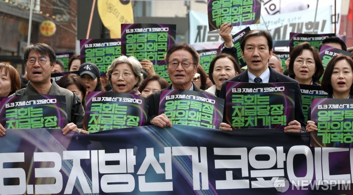 [서울=뉴스핌] 이건주 인턴기자 = 조국 조국혁신당 대표 등 야당 관계자들이 5일 오전 서울 영등포역 앞에서 열린 '2026 지방선거 정치개혁 촉구 시민대행진'에 참석하고 있다. 참가자들은 기자회견 후 국회 본청까지 행진하며 선거제도 개혁 입법을 촉구했다. 2026.03.05 kunjoo@newspim.com