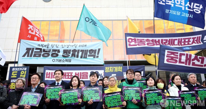 [서울=뉴스핌] 이건주 인턴기자 = 조국 조국혁신당 대표 등 야당 관계자들이 5일 오전 서울 영등포역 앞에서 열린 '2026 지방선거 정치개혁 촉구 시민대행진'에서 피켓을 들고 있다. 2026.03.05 kunjoo@newspim.com