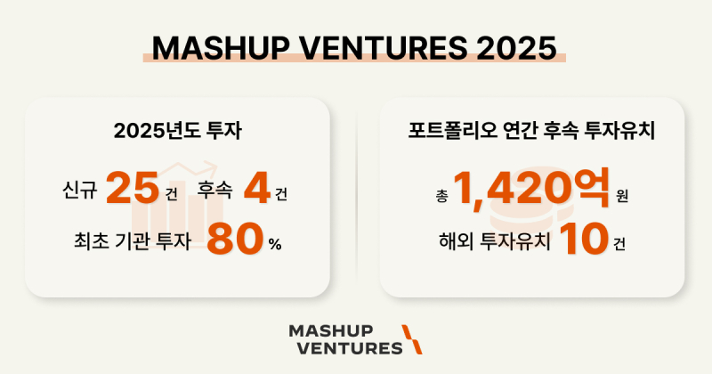 매쉬업벤처스는 지난해 신규 투자 25건, 후속 투자 4건 등 총 29건의 투자를 집행했다. 특히 신규 투자 기업 10곳 중 8곳은 기관으로부터 처음 투자를 받는 극초기 단계다. 유망한 팀을 가장 먼저 발견해 성장을 돕는 매쉬업벤처스 특유의 역량이 반영된 결과인 셈이다.