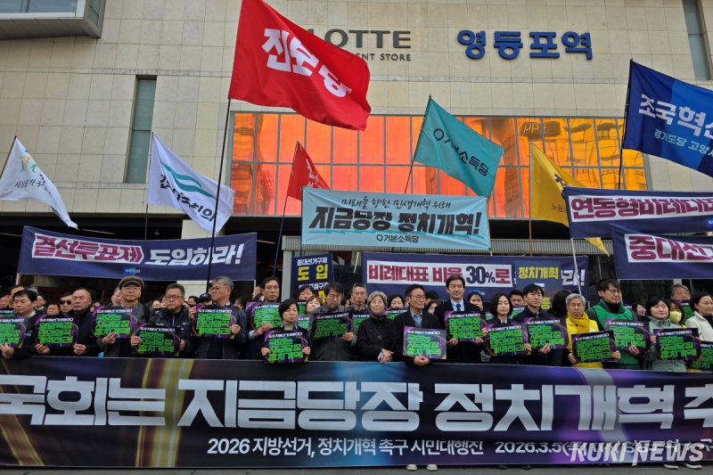 이들은 5일 영등포역 앞 광장에서 ‘2026 지방선거, 정치개혁 촉구 시민대행진’ 행사를 열고 국회 본청까지 행진하며 △양당이 독점하는 기초의회 2인 선거구 폐지 및 3인 이상 선거구제 전면 도입 △광역자치단체장 선거 결선투표제 도입 △광역의회 비례대표 의석 비율 현행 10% 수준에서 최소 20% 이상 확대 △공천 시 특정 성별 ‘10분의 6 제한’ 제도화 등을 요구했다.