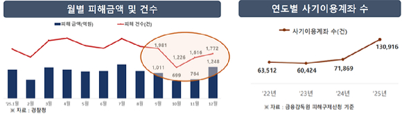 2026년 금융감독원 민생 금융 부문 업무 계획. 보이스 피싱 월별 피해 금액·건수 및 연도별 사기 이용 계좌 수 [사진=금융감독원] |