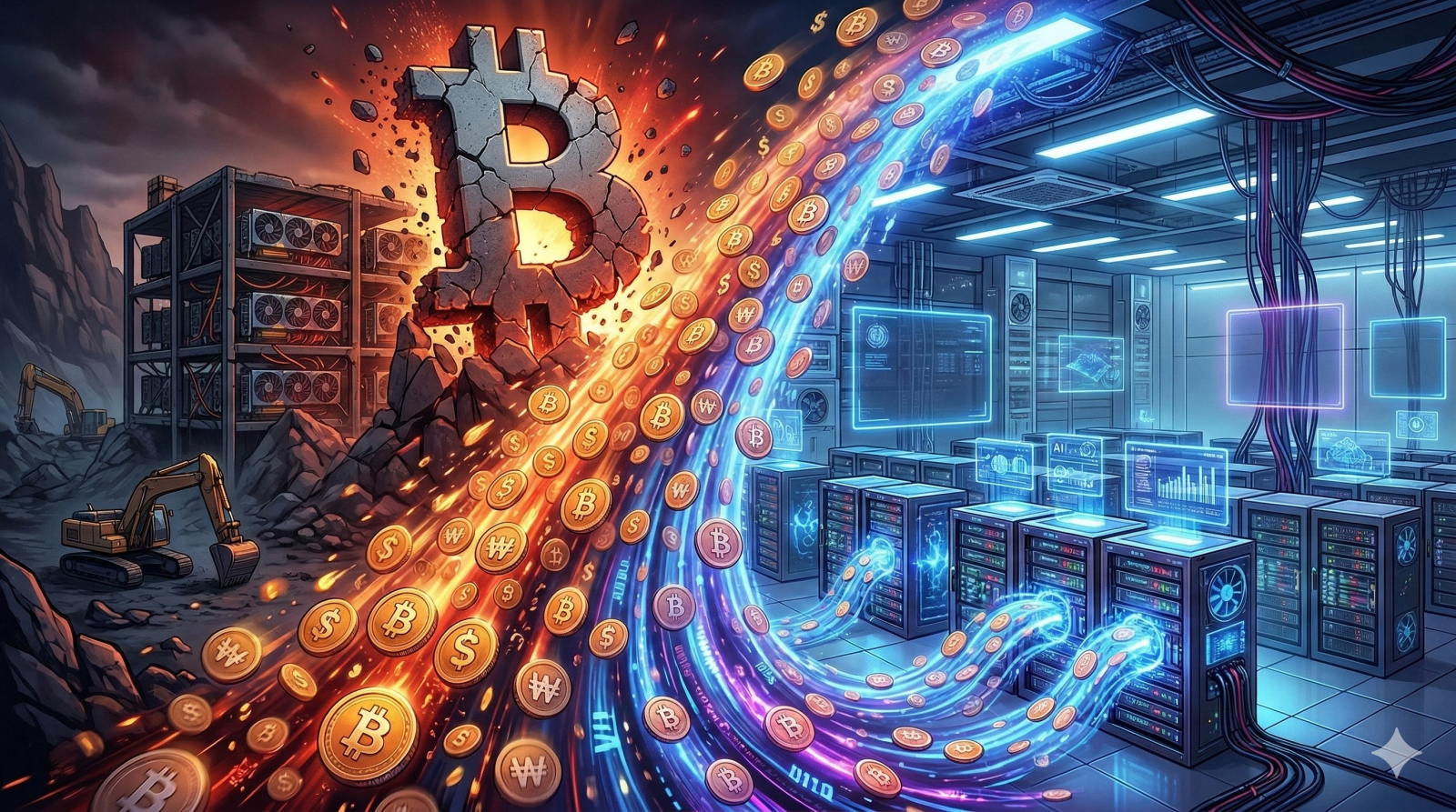 비트코인 채굴 산업이 AI 데이터센터 사업으로 전환되는 흐름을 표현한 이미지. 채굴 서버와 AI 데이터센터 간 자금과 인프라 이동을 시각화했다. 제미나이 생성 이미지 |