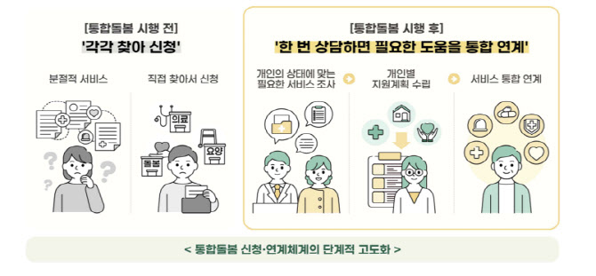 제도 기반도 함께 정비한다. 정부는 중앙정부와 지방자치단체 간 협력체계를 구축하고, 지역 단위 통합지원협의체를 통해 의료기관, 복지기관 등 다양한 서비스 제공 기관 간 연계를 강화할 방침이다. 또한 사회적 입원·감소율 등 성과지표를 반영해 예산을 지원하고, 정보연계 시스템을 구축해 통합돌봄 운영 효율성을 높일 계획이다. 향후에는 서비스별 신청이 필요해 한 번의 조사로 별도 신청없이 필요한 서비스가 자동 연계되도록 관련 법령과 제도 개선도 추진한다.