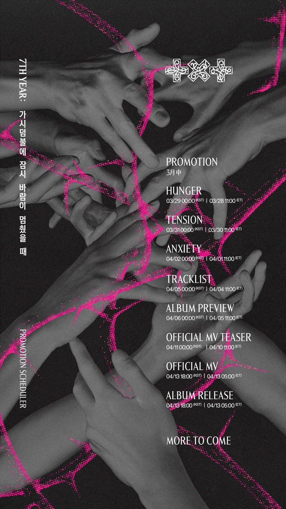 투모로우바이투게더는 앞서 신보의 분위기를 담은 공식 트레일러와 ‘THORN’ 버전의 콘셉트 포토를 공개해 새로운 챕터의 서막을 열었다. 오는 3월 29일부터 4월 2일까지 ‘HUNGER’, ‘TENSION’, ‘ANXIETY’ 버전의 사진이 추가적으로 베일을 벗는다. 이후 4월 5일 트랙리스트, 4월 6일 앨범 프리뷰가 공개돼 신보 윤곽이 드러난다. 4월 11일에는 타이틀곡 뮤직비디오 티저로 컴백 열기를 고조시킬 전망이다. 3월 중 전개되는 베일에 싸인 프로모션과 ‘MORE TO COME’이라는 문구는 전 세계 모아(MOA.팬덤명)의 호기심을 자극한다.