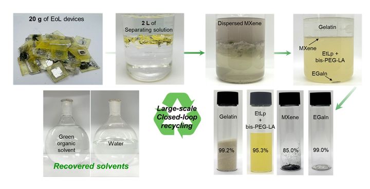 수명이 다한 기기를 친환경 혼합 용매에 담그면 각 구성 요소가 스스로 층을 나뉘며 분해돼 복잡한 물리적 공정 없이도 고순도 원료 및 재활용 용매를 회수할 수 있음을 보였다.