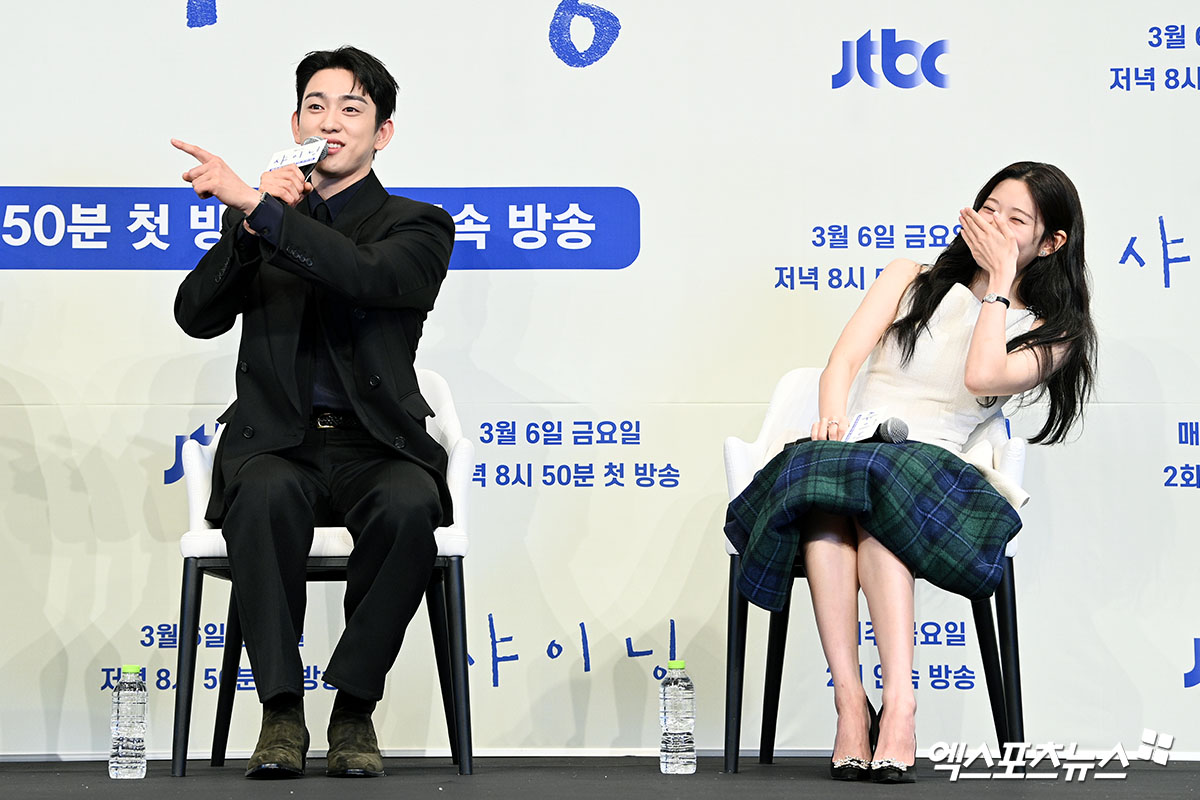 이날 제작발표회에 참석한 배우 박진영, 김민주가 질의응답 시간을 갖고 있다.