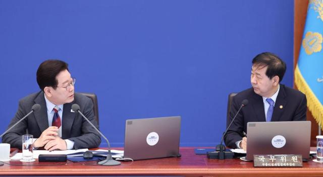 President Lee Jae Myung (left) talks with Deputy Prime Minister and Finance Minister Koo Yoon-cheol during a Cabinet meeting at Cheong Wa Dae in Seoul on March 5, 2026. Yonhap |