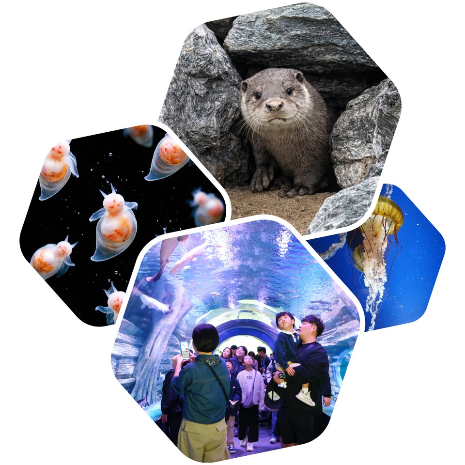 위부터 시계 방향으로 수달, 해파리 '퍼시픽 씨 네틀', 수족관, 클리오네. |