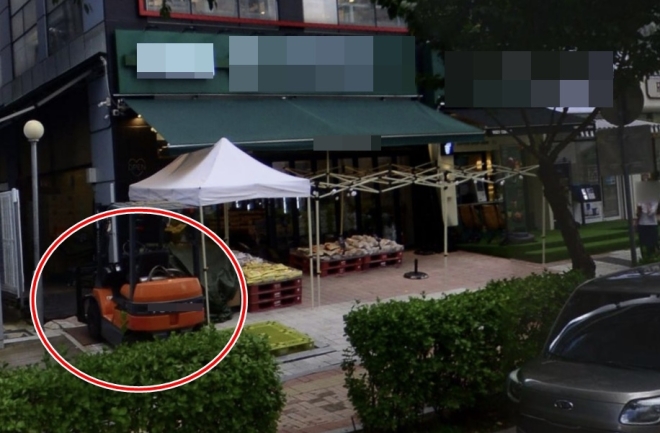 매장 측의 불법 주차 행태는 네이버 지도의 ‘거리뷰’에도 포착됐다. 거리뷰에 담긴 매장 전경을 보면 지게차가 매장 입구 왼쪽의 경사면에 주차돼 있다. 거리뷰는 지난해 9월 촬영된 것으로, 이러한 행태가 최소 6개월 동안 이어진 셈이다.
