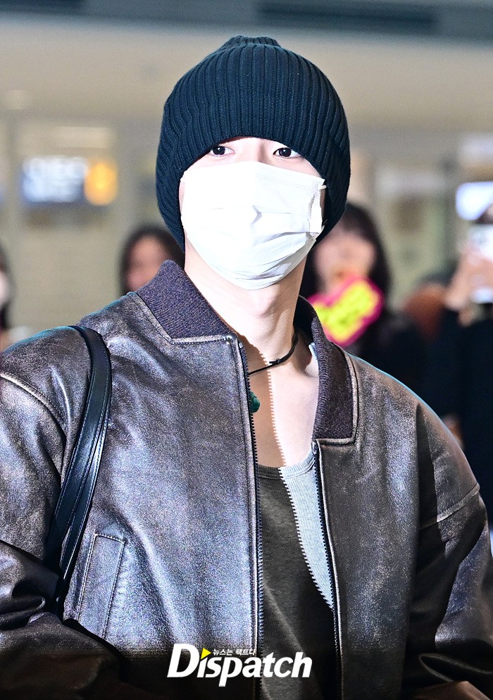 상원은 가죽재킷과 블랙진으로 캐주얼한 공항패션을 연출했다. 마스크에도 똘망똘망한 눈빛이 인상적이였다.