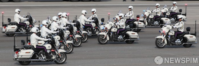 [성남=뉴스핌] 이형석 기자 = 지난 22일 오전 경기도 성남시 서울공항에서 열린 건군 75주년 국군의 날 최종 리허설에서 군사경찰단이 모터사이클 퍼레이드를 선보이고 있다. 2023.09.26 leehs@newspim.com |