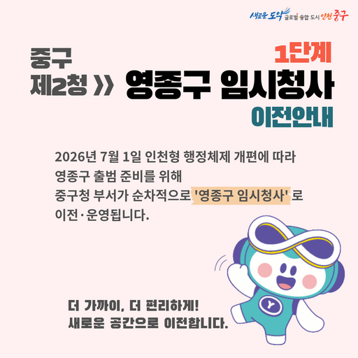 인천시 중구(구청장 김정헌)는 영종구 출범을 앞두고 원활한 임시청사 개청 준비를 위해 부서를 순차적으로 이전한다고 5일 밝혔다. 영종구 임시청사는 영종하늘도시 중산동(중구 하늘중앙로 201) 3~10층에 설치되며, 부서 성격과 민원 편의를 고려해 총 3단계로 이전이 진행된다.