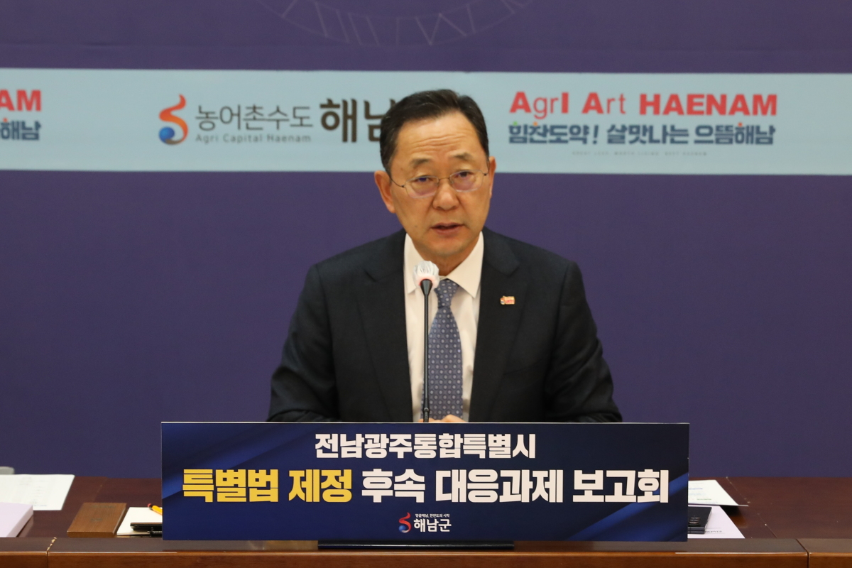 해남군은 5일 군청 상황실에서 '전남광주통합특별시 설치 특례법' 제정에 따른 대응과제 보고회를 열고 통합특별시 출범에 대비한 종합 대응전략을 논의했다고 밝혔다.