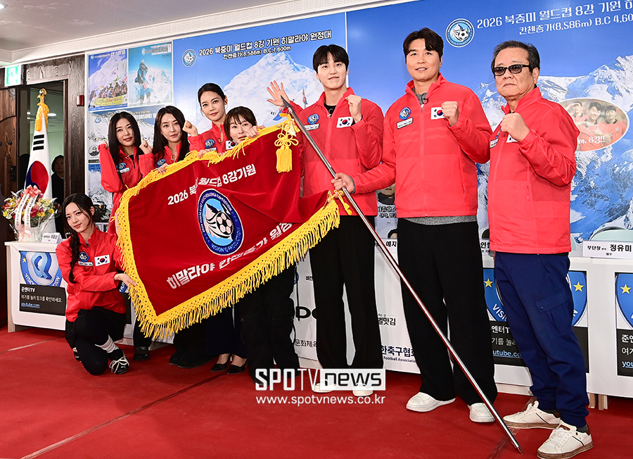 [스포티비뉴스=서울, 곽혜미 기자] 2026 북중미 월드컵 8강 진출을 기원하는 '히말라야 원정대'가 5일 오후 서울 영등포구 비전Q 프로덕션 사옥에서 발대식을 개최했다. 박해린, 유빈, 정유미, 안현모, 예지원, 이태환, 이동국, 이준훈 단장이 포즈를 취하고 있다.