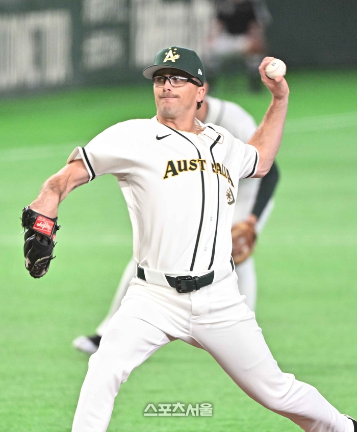 WBC 호주 야구대표팀의 알렉스 웰스가 5일 일본 도쿄 도쿄돔에서 열린 대만과의 경기에 선발 등판해 힘차게 공을 던지고 있다. 알렉스 웰스는 함께 호주 대표팀으로 선발된 LG 트윈스의 아시아쿼터 라크란 웰스의 쌍동이 형이다. 2026. 3. 5.