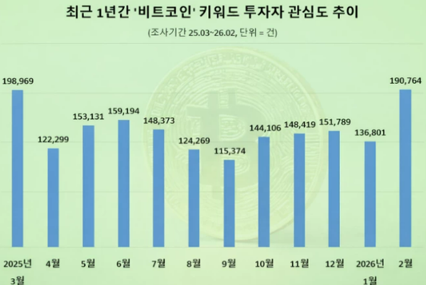 지난달 비트코인 가격이 8900만원대까지 추락하는 등 계속 약세를 보였지만 투자자 관심도는 19만 764건으로 껑충 뛰었다. 2월이 1월에 비해 3일이나 모자란 28일 뿐이란 것을 감안하면 사실상 20만건을 크게 넘었다는 분석이 가능하며 이는 12개월래 최다 정보량이다.