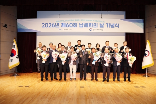 (광주=연합뉴스) 여운창 기자 = 광주지방국세청은 5일 정부광주지방합동청사 2층 대강당에서 개청 60주년과 제60회 납세자의 날 기념식을 열고 모범납세자와 세정협조자 등 91명에게 정부포상 표창장 등을 전달했다.