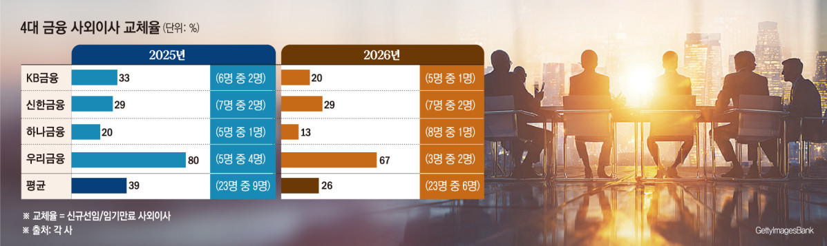 이는 지난해 정기 주주총회에서 임기 만료 사외이사 23명 중 9명이 신규 후보로 교체된 점을 감안하면 변화 폭이 상대적으로 작다. 세부적으로는 하나금융이 임기 만료 사외이사 8명 중 단 1명(12.5%)만을 신규 후보로 추천했다. KB금융은 5명 중 1명을 교체하는 안건을 상정해 20%를 기록했으며, 신한금융은 7명 중 2명을 신규 추천하며 전년과 동일한 28.6% 수준을 유지했다. 지난해 사외이사 5명 중 4명을 교체했던 우리금융은 올해 임기 만료 대상자 3명 중 2명을 신규 후보로 공시하며 66.7%의 교체율을 보였다.
