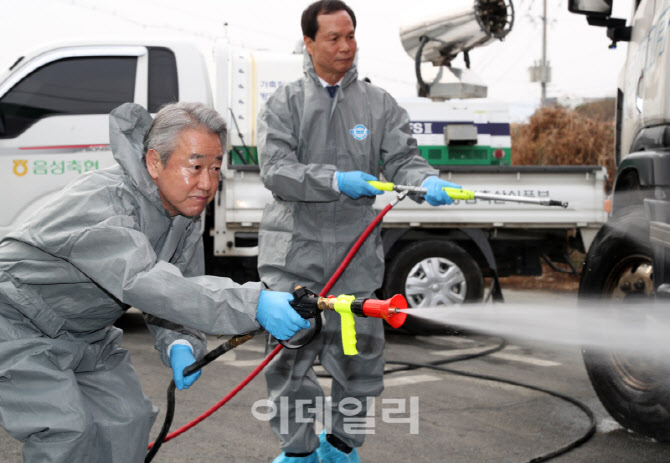 [이데일리 김태형 기자] 강호동(왼쪽) 농협중앙회장과 조병옥 음성군수가 5일 충북 음성군 삼성면 거점소독시설을 방문해 현장 점검을 하고 차량 소독을 하고 있다.