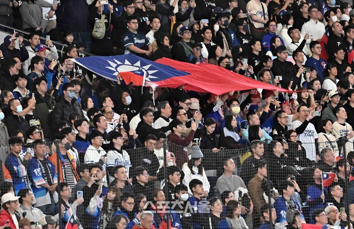WBC 대만야구대표팀 응원단이 5일 일본 도쿄 도쿄돔에서 열린 호주와의 경기에 앞서 대만 국기를 펼치며 응원하고 있다. 대만은 WBC에서 자국 국기(청천백일만지홍기)를 사용하지 못하고, ‘차이니스 타이베이’ 명칭과 대만올림픽위원회기(매화기)를 사용하게 되었다. 다만 관중들의 대만 국기 반입은 허용되었다. 2026. 3. 5.