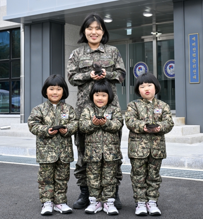 해군 제8전투훈련단 소속 이은주(37) 상사가 소아암 아동들을 돕기 위해 지난 3일 세쌍둥이 딸 장은진·유진·소진(5)양과 함께 모발을 기부했다.