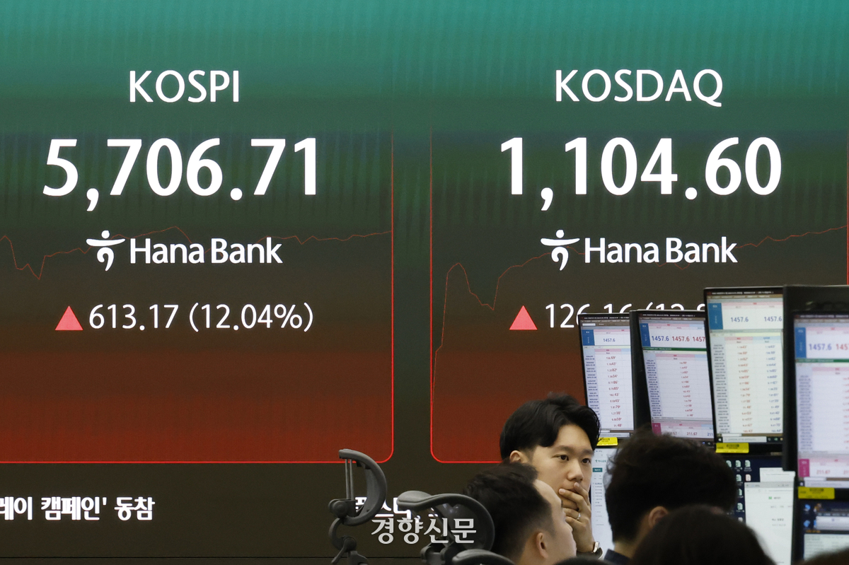 전날 역대 최악의 하락률을 기록한 국내 증시가 5일 폭등세를 보이면서 ‘역대급 상승률’을 기록했다. 코스피는 10%나 뛰며 2008년 이후 최고 상승률을 기록했고, 코스닥은 15% 뛰며 역대 최고 상승률을 기록했다.