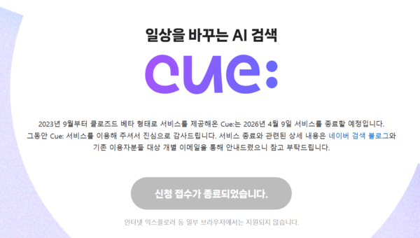 큐는 서비스 종료 예정에 따라 서비스 이용 신청도 지난 2일 마무리한 상태다. 또 내달 서비스 종료 이후에는 클로바X와 큐에 접속하거나 신규 대화를 이용할 수 없다.