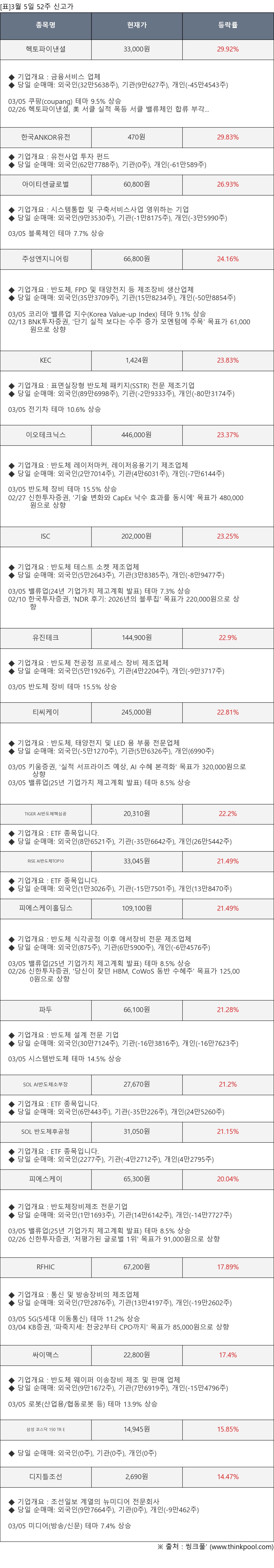 ※ 관련 종목: 헥토파이낸셜, 한국ANKOR유전, 아이티센글로벌, 주성엔지니어링, KEC, 이오테크닉스, ISC, 유진테크, 티씨케이, TIGER AI반도체핵심공, RISE AI반도체TOP10, 피에스케이홀딩스, 파두, SOL AI반도체소부장, SOL 반도체후공정, 피에스케이, RFHIC, 싸이맥스, 삼성 코스닥 150 TR E, 디지틀조선