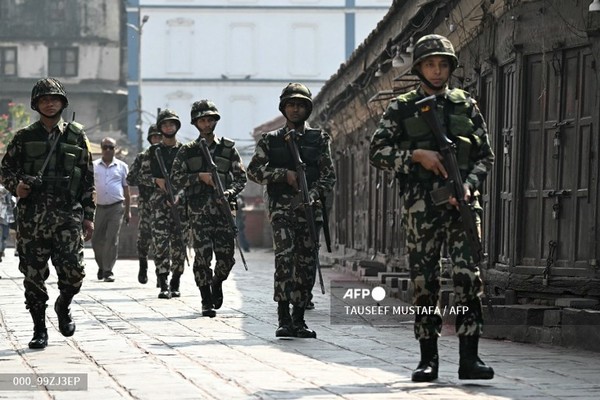 (네팔=국제뉴스) 박원준 기자 = 5일(현지시간) 네팔 카트만두에서 총선이 실시된 가운데 군인들이 거리를 순찰하고 있다.