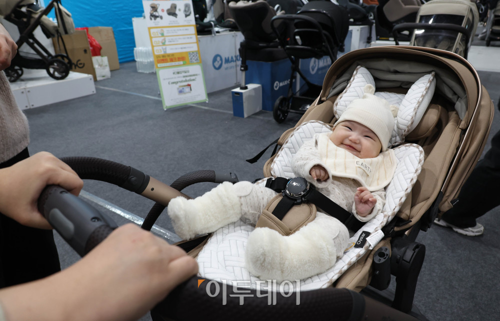 5일 서울 강서구 코엑스마곡에서 열린 2026 마이비베 마곡 베이비페어&유아교육전에서 아기가 유아차에 앉아있다. 약 360부스 규모로 열리는 이번 행사는 임신·출산 단계부터 육아 초기까지 다양한 분야의 업체들이 참가하며 8일까지 진행된다. 고이란 기자 photoeran@ |