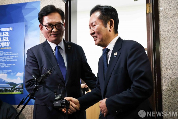 [서울=뉴스핌] 윤창빈 기자 = 송영길 더불어민주당 전 대표가 5일 오후 서울 여의도 국회에서 정청래 더불어민주당 대표와 면담을 마치고 나서고 있다. 2026.03.05 pangbin@newspim.com