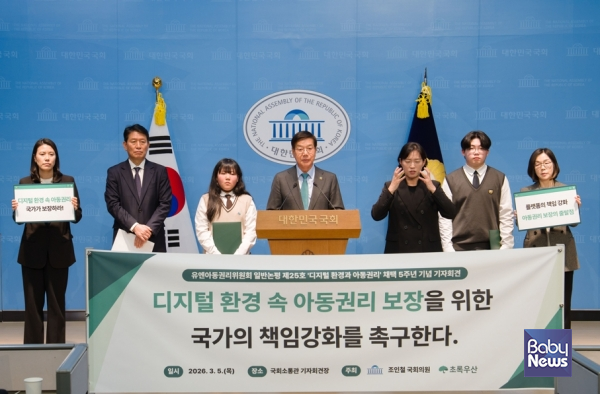 아동복지전문기관 초록우산(회장 황영기)이 조인철 더불어민주당(광주 서구갑) 의원과 5일 서울 여의도 국회 소통관에서 기자회견을 열고 디지털 환경 속 아동권리보장을 위한 실천에 나설 것을 촉구했다. ⓒ초록우산 |