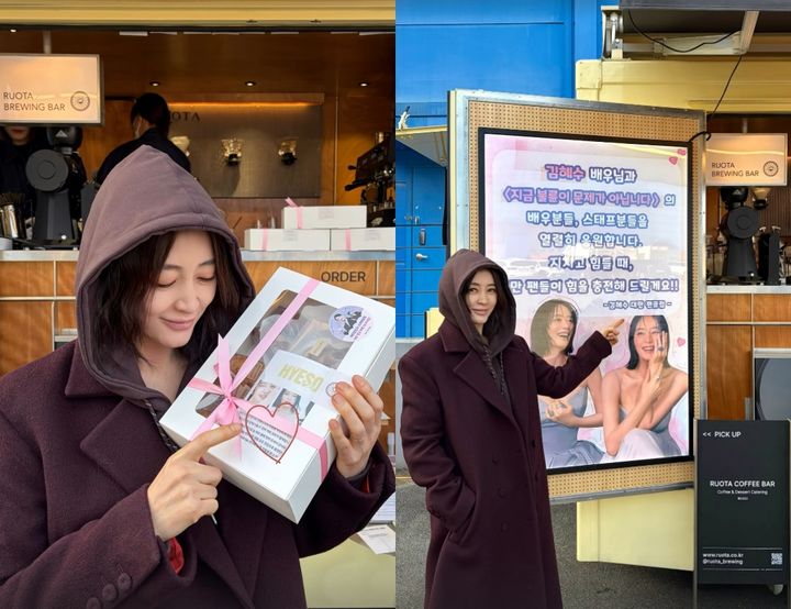 사진에는 김혜수의 차기작인 쿠팡플레이 새 시리즈 '지금 불륜이 문제가 아닙니다' 촬영장에 도착한 커피차 선물들이 담겼다.