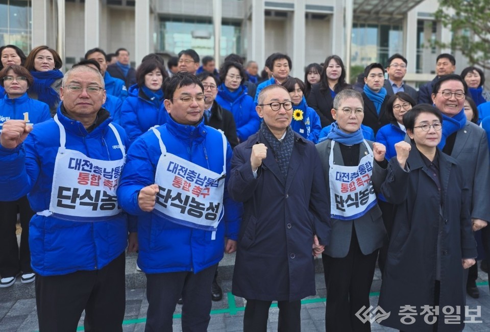 더불어민주당 김안태 대덕구청장 예비후보(왼쪽 첫 번째)가 대전충남 행정통합 촉구 단식 농성 현장에서 참석자들과 함께 구호를 외치고 있다 |