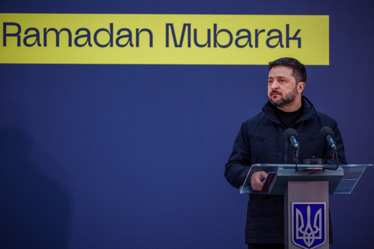 볼로디미르 젤렌스키 우크라이나 대통령이 지난 2일(현지시간) 키이우의 한 모스크 근처에서 라마단 금식을 해제하는 이프타르 식사를 함께하기 전 우크라이나 무슬림 군인들에게 연설하고 있다.[로이터] |