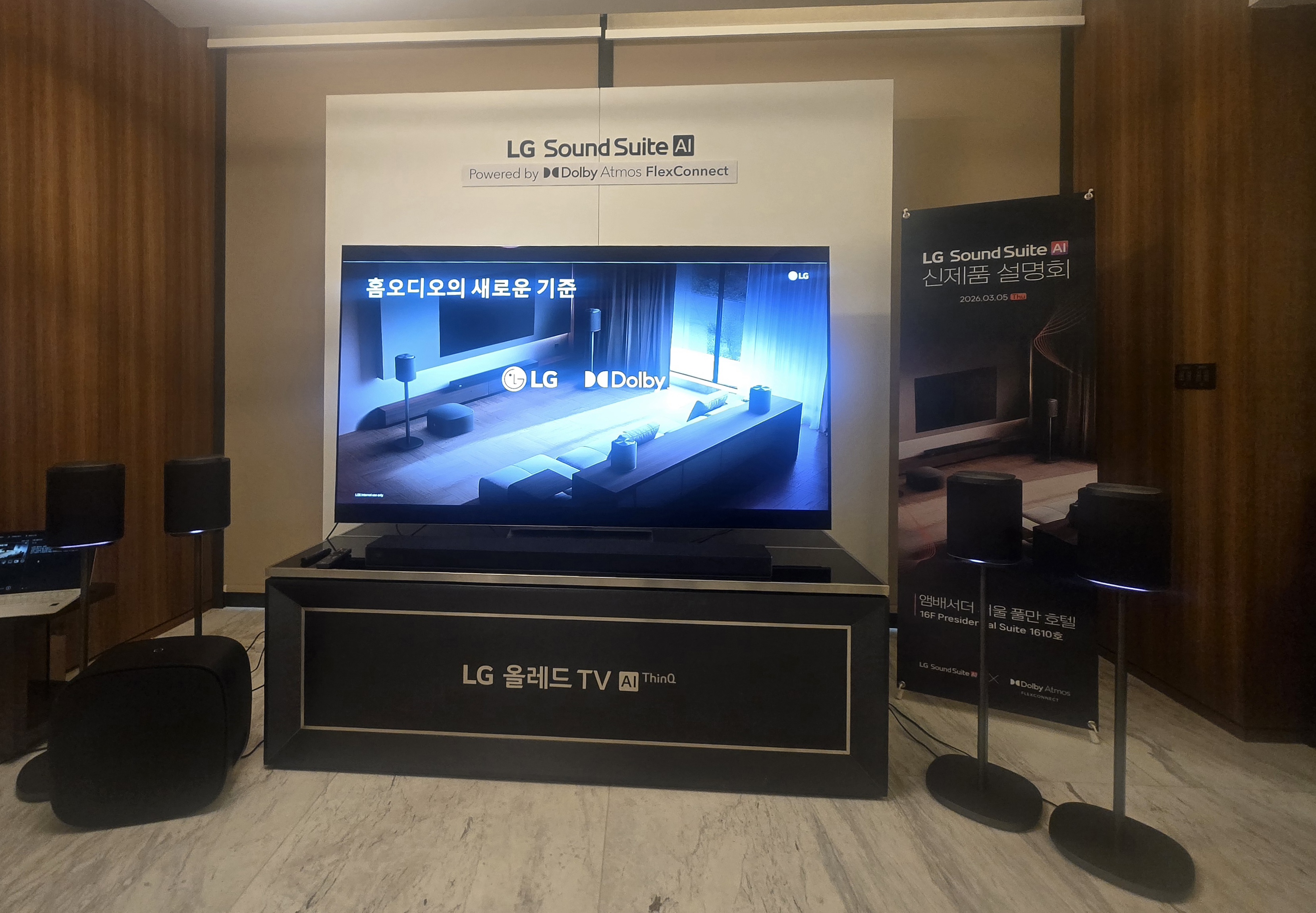 LG전자는 5일 서울 중구 앰배서더 서울 풀만 호텔에서 프리미엄 홈 오디오 시스템 'LG 사운드 스위트'를 공개했다. 핵심은 '설치 제약을 없앤 공간 음향'이다. 스피커를 정해진 위치에 맞추고 복잡한 배선을 숨겨야 했던 기존 홈시어터 방식을 인공지능(AI)과 무선 기술로 바꿨다.