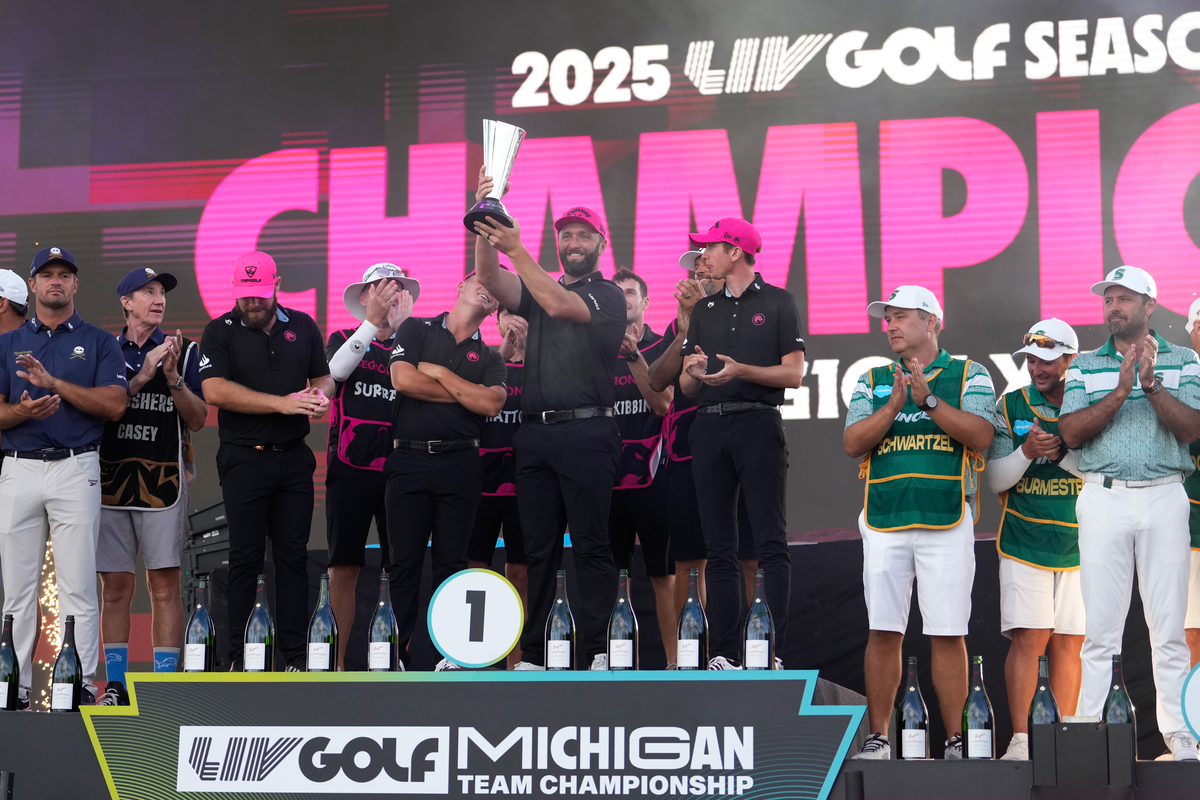 존 람이 지난해 8월 25일 열린 LIV 골프 팀 챔피언십에서 우승한 뒤 자신의 리전13 동료들과 함께 시상대에 올라 우승 트로피를 들어올리고 있다. 게티이미지코리아 |