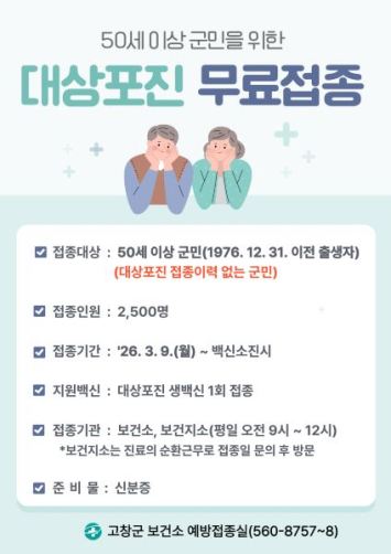 특히 발병 후 치료가 어렵고 후유증이 장기간 지속될 수 있어 예방이 무엇보다 중요하다. 이에 고창군 보건소는 군민의 건강을 지키기 위해 무료 예방접종 사업을 적극 추진하고 있다.